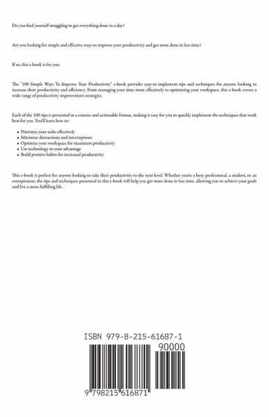 Do you find yourself struggling to get everything done in a day? Are you looking for simple and effective ways to improve your productivity and get more done in less time? If so, this ebook is for you. The "100 Simple Ways To Improve Your Productivity" ebook provides easy-to-implement tips and techniques for anyone looking to increase their productivity and efficiency. From managing your time more effectively to optimizing your workspace, this ebook covers a wide range of productivity improvement strategies. Each of the 100 tips is presented in a concise and actionable format, making it easy for you to quickly implement the techniques that work best for you. You'll learn how to:Prioritize your tasks effectively Minimize distractions and interruptions Optimize your workspace for maximum productivity Use technology to your advantage Build positive habits for increased productivity This ebook is perfect for anyone looking to take their productivity to the next level. Whether you're a busy professional, a student, or an entrepreneur, the tips and techniques presented in this ebook will help you get more done in less time, allowing you to achieve your goals and live a more fulfilling life.