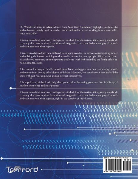 20 Wonderful Ways to Make Money from Your Own Computer' highlights the methods the author has successfully implemented to earn a comfortable income working from a home office since early 2004. It is easy to read and informative with pictures included for illustration. With gloomy worldwide economy, this book provides fresh ideas and insights for the retrenched or unemployed to work and earn money in their pajamas, right in the comfort of their homes. It is never too late to learn new skills and techniques even for the novice to start making money and milking the internet which provides a stabl...