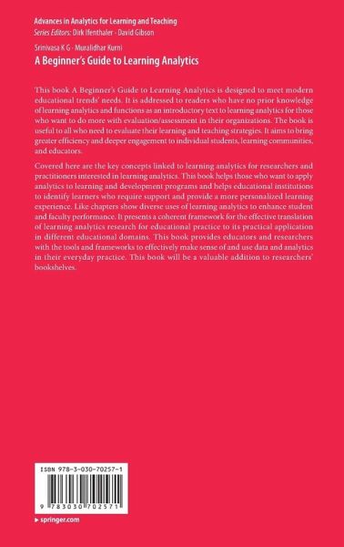 This book A Beginner's Guide to Learning Analytics is designed to meet modern educational trends' needs. It is addressed to readers who have no prior knowledge of learning analytics and functions as an introductory text to learning analytics for those who want to do more with evaluation/assessment in their organizations. The book is useful to all who need to evaluate their learning and teaching strategies. It aims to bring greater efficiency and deeper engagement to individual students, learning communities, and educators.