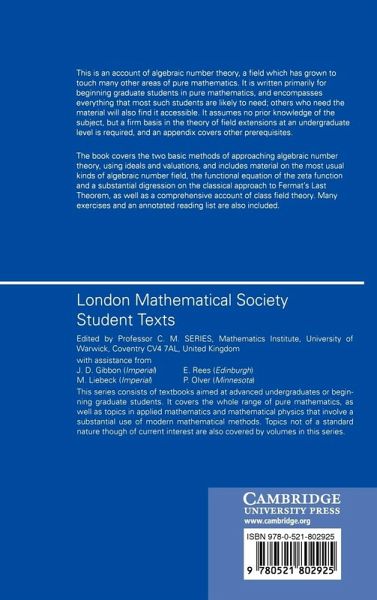 This is a 2001 account of Algebraic Number Theory, a field which has grown to touch many other areas of pure mathematics. It is written primarily for beginning graduate students in pure mathematics, and encompasses everything that most such students are likely to need; others who need the material will also find it accessible. It assumes no prior knowledge of the subject, but a firm basis in the theory of field extensions at an undergraduate level is required, and an appendix covers other prerequisites. The book covers the two basic methods of approaching Algebraic Number Theory, using ideals and valuations, and includes material on the most usual kinds of algebraic number field, the functional equation of the zeta function and a substantial digression on the classical approach to Fermat's Last Theorem, as well as a comprehensive account of class field theory. Many exercises and an annotated reading list are also included.