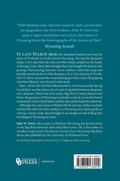 In late March 1909, five sheepmen headed east from the town of Worland, in north-central Wyoming, driving five thousand sheep. A few days later the men and their sheep camped on the banks of Spring Creek, where they thought they had brought the herd to safe grazing. That evening, however, seven cowboys raided the camp and brutally murdered three of the sheepmen. In A Vast Amount of Trouble, John W. Davis recounts the events leading up to this crime, the gripping trial that followed, and the trial¿s aftermath, which was no less than to bring an end to Wyoming¿s violent range wars.