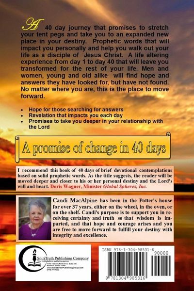 A 40 day journey that promises to stretch your tent pegs and take you to an expanded new place in your destiny. Prophetic words that will impact you personally and help you walk out your life as a disciple of Jesus Christ. A life altering experience from day 1 to day 40 that will leave you transformed for the rest of your life. Men and women, young and old alike will find hope and answers they have looked for, but have not found. No matter where you are, this is the place to move forward. ¿ Hope for those searching for answers ¿ Revelation that impacts you each day ¿ Promises to take you deeper in your relationship with the Lord A promise of change in 40 days