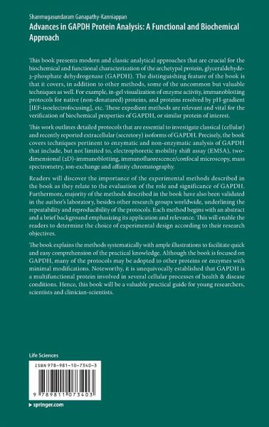 This book presents modern and classic analytical approaches that are crucial for the biochemical and functional characterization of the archetypal protein, glyceraldehyde-3-phosphate dehydrogenase (GAPDH). The distinguishing feature of the book is that it covers, in addition to other methods, some of the uncommon but valuable techniques as well. For example, in-gel visualization of enzyme activity, immunoblotting protocols for native (non-denatured) proteins, and proteins resolved by pH-gradient [IEF-isoelectrofocusing], etc. These expedient methods are relevant and vital for the verification of biochemical properties of GAPDH, or similar protein of interest.