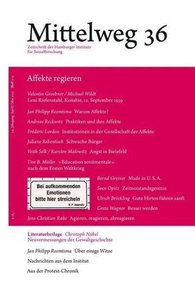 Valentin Groebner, Michael Wildt: Leni Riefenstahl, Konskie, 12. September 1939. Hinschauen, fühlen, fotografiert werden (S. 5-14) / Jan Philipp Reemtsma: Warum Affekte? (S. 15-26) / Andreas Reckwitz: Praktiken und ihre Affekte (S. 27-45) / Frédéric Lordon: Institutionen in der Gesellschaft der Affekte (S. 46-73) / Juliane Rebentisch: Der schwache Bürger, die unreine Souveränität und das Phantom Öffentlichkeit (S. 74-91) / Veith Selk, Karsten Malowitz: Angst in Bielefeld. Über ein ausgeschlossenes Gefühl in der Systemtheorie (S. 92-116) / Tim B. Müller: 'Education sentimentale' nach dem Ersten Weltkrieg. Emotionale Bestandsvoraussetzungen der Demokratie (S. 117-135) / Bernd Greiner: Made in U. S. A. Über politische Ängste und Paranoia (S. 137-155) / Sven Opitz: Zeitnotstandsgesetze. Affekte und Recht im Antiterrorkrieg (S. 156-170) / Ulrich Bröckling: Gute Hirten führen sanft. Über Mediation (S. 171-186) / Greta Wagner: Besser werden. Praktiken emotionaler Selbststeuerung (S. 188-210) / Jens-Christian Rabe: Agieren, reagieren, abreagieren. Hass als populäre Kunst (S. 2011-224) / Jan Philipp Reemtsma: Über einige Witze (S. 249-258) /