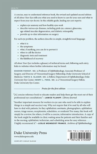 A concise, easy-to-understand reference book, the revised and updated second edition of All about Your Eyes tells you what you need to know to care for your eyes and what to expect from your eye doctor. In this reliable guide, leading eye care experts: * explain eye anatomy and how healthy eyes work * describe various eye diseases, including pink eye, cataract, glaucoma, age-related macular degeneration, and diabetic retinopathy * provide up-to-date information on surgery For each eye problem, the authors describe in simple, straightforward language: * what it is * the symptoms * what, if anything, you can do to prevent it * when to call the doctor * diagnostic tests and treatment * the likelihood of recovery All about Your Eyes includes a glossary of technical terms and, following each entry, links to websites where further information may be found. Contributors. Natalie A. Afshari, MD, Rosanna P. Bahadur, MD, Paramjit K. Bhullar, MD, Faith A. Birnbaum, MD, Cassandra C. Brooks, MD, Pratap Challa, MD, Melissa Mei-Hsia Chan, MBBS, Ravi Chandrashekhar, MD, MSEE, Nathan Cheung, OD, FAAO Claudia S. Cohen, MD, Vincent A. Deramo, MD, Cathy DiBernardo, RN, Laura B. Enyedi, MD, Sharon Fekrat, MD, Henry L. Feng, MD, Brenton D. Finklea, MD, Anna Ginter, MD, Tanya S. Glaser, MD, Michelle Sy Go, MD, MS, Mark Goerlitz-Jessen, MD, Herb Greenman, MD, Abhilash Guduru, MD, Preeya Gupta, MD, Renee Halberg, MSW, LCSW, S. Tammy Hsu, MD, Alessandro Iannaccone, MD, MS, FARVO, Charlene L. James, OD, Kim Jiramongkolchai, MD, Michael P. Kelly, FOPS, Muge R. Kesen, MD, Kirin Khan, MD, Wajiha Jurdi Kheir, MD, Jane S. Kim, MD, Jennifer Lira, MD, Katy C. Liu, MD, PhD, Ramiro S. Maldonado, MD, Ankur Mehra, MD, Priyatham S. Mettu, MD, Prithvi Mruthyunjaya, MD, MHS, Nisha Mukherjee, MD, Kenneth Neufeld, MD, Kristen Peterson, MD, James H. Powers, MD, S. Grace Prakalapakorn, MD, MPH, Michael Quist, MD, Leon Rafailov, MD, Roshni Ranjit-Reeves, MD, Nikolas Raufi, MD, William Raynor, BS, Cason Robbins, BS, Ananth Sastry, MD, Dianna L. Seldomridge, MD, MBA, Terry Semchyshyn, MD, Ann Shue, MD, Julia Song, MD, Brian Stagg, MD, Christopher Sun, MBBS, Anthony Therattil, BS, Daniel S.W. Ting, MBBS, Fay Jobe Tripp, MS, OTR/L, CLVT, CDRS, Obinna Umunakwe, MD, PhD, Lejla Vajzovic, MD, Susan M. Wakil, MD, C. Ellis Wisely, MD, MBA, Julie A. Woodward, MD