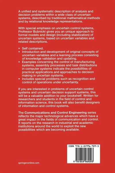 Problems, methods and algorithms of decision making based on an uncertain knowledge now create a large and intensively developing area in the field of knowledge-based decision support systems. The main aim of this book is to present a unified, systematic description of analysis and decision problems in a wide class of uncertain systems described by traditional mathematical models and by relational knowledge representations. A part of the book is devoted to new original ideas introduced and developed by the author: the concept of uncertain variables and the idea of a learning process consisting in knowledge validation and updating. In a certain sense this work may be considered as an extension of the author's monograph Uncertain Logics, Variables and Systems (Springer-Verlag, 2002). In this book it has been shown how the different descriptions of uncertainty based on random, uncertain and fuzzy variables may be treated uniformly and applied as tools for general analysis and decision problems, and for specific uncertain systems and problems (dynamical control systems, operation systems, knowledge-based pattern recognition under uncertainty, task allocation in a set of multiprocessors with uncertain execution times, and decision making in an assembly system as an example of an uncertain manufacturing system). The topics and the organization of the text are presented in Chapter 1 (Sects 1. 1 and 1. 4). The material presented in the book is self-contained.