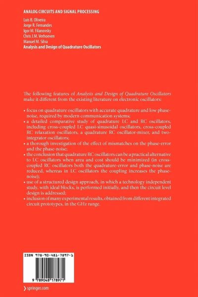 Modern RF receivers and transmitters require quadrature oscillators with accurate quadrature and low phase-noise. Existing literature is dedicated mainly to single oscillators, and is strongly biased towards LC oscillators. This book is devoted to quadrature oscillatorsand presents adetailed comparative study ofLC and RCosc- lators, both at architectural and at circuit levels. It is shown that in cross-coupled RC oscillators both the quadrature error and phase-noise are reduced, whereas in LC - cillators the coupling decreases the quadrature error, but increases the phase-noise. Thus, quadrature RC oscillators can be a practical alternative to LC oscillators, - pecially when area and cost are to be minimized. The main topics of the book are: cross-coupled LC quasi-sinusoidal oscillators, cross-coupled RC relaxation oscillators, a quadrature RC oscillator-mixer, and t- integrator oscillators. The effect of mismatches on the phase-error and the pha- noise are thoroughly investigated. The book includes many experimental results, obtained from different integrated circuit prototypes, in the GHz range. A structured design approach is followed: a technology independent study, with ideal blocks, is performed initially, and then the circuit level design is addressed. This book can be used in advanced courses on RF circuit design. In addition to post-graduate students and lecturers, this book will be of interest to design engineers and researchers in this area.