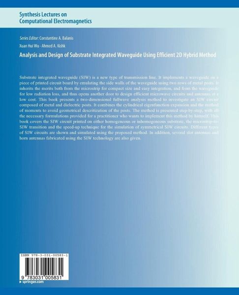 Substrate integrated waveguide (SIW) is a new type of transmission line. It implements a waveguide on a piece of printed circuit board by emulating the side walls of the waveguide using two rows of metal posts. It inherits the merits both from the microstrip for compact size and easy integration, and from the waveguide for low radiation loss, and thus opens another door to design efficient microwave circuits and antennas at a low cost. This book presents a two-dimensional fullwave analysis method to investigate an SIW circuit composed of metal and dielectric posts. It combines the cylindrical eigenfunction expansion and the method of moments to avoid geometrical descritization of the posts. The method is presented step-by-step, with all the necessary formulations provided for a practitioner who wants to implement this method by himself. This book covers the SIW circuit printed on either homogeneous or inhomogeneous substrate, the microstrip-to-SIW transition and the speed-up techniquefor the simulation of symmetrical SIW circuits. Different types of SIW circuits are shown and simulated using the proposed method. In addition, several slot antennas and horn antennas fabricated using the SIW technology are also given. Table of Contents: Introduction / SIW Circuits Composed of Metallic Posts / SIW Circuits with Dielectric Posts / Even-Odd Mode Analysis of a Symmetrical Circuit / Microstrip to SIW Transition and Half Mode SIW / SIW Antennas