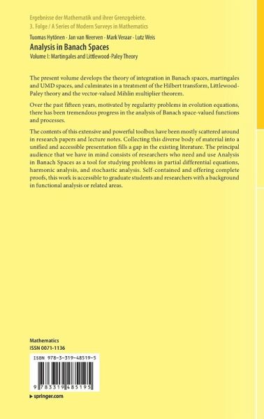 The present volume develops the theory of integration in Banach spaces, martingales and UMD spaces, and culminates in a treatment of the Hilbert transform, Littlewood-Paley theory and the vector-valued Mihlin multiplier theorem.