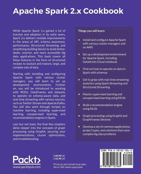 Perform lightning-fast Big Data processing using Apache Spark 2.x with help of this practical guide Key Features: - Contains quick solutions to solving even the most complex Big Data processing problems using Apache Spark - Leverage the power of Apache Spark as a unified compute engine and perform streaming analytics, machine learning and graph processing with ease - From installing and setting up Spark to fine-tuning its performance, this practical guide is all you need to become a master in using Apache Spark Book Description: While Apache Spark 1.x gained a lot of traction and adoption in the early years, Spark 2.x delivers notable improvements in the areas of API, schema awareness, Performance, Structured Streaming, and simplifying building blocks to build better, faster, smarter, and more accessible big data applications. This book uncovers all these features in the form of structured recipes to analyze and mature large and complex sets of data. Starting with installing and configuring Apache Spark with various cluster managers, you will learn to set up development environments. Further on, you will be introduced to working with RDDs, DataFrames and Datasets to operate on schema aware data, and real-time streaming with various sources such as Twitter Stream and Apache Kafka. You will also work through recipes on machine learning, including supervised learning, unsupervised learning & recommendation engines in Spark. Last but not least, the final few chapters delve deeper into the concepts of graph processing using GraphX, securing your implementations, cluster optimization, and troubleshooting. What You Will Learn: - Install and configure Apache Spark with various cluster managers & on AWS - Set up a development environment for Apache Spark including Databricks Cloud notebook - Find out how to operate on data in Spark with schemas - Get to grips with real-time streaming analytics using Spark Streaming & Structured Streaming - Master supervised learning and unsupervised learning using MLlib - Build a recommendation engine using MLlib - Graph processing using GraphX and GraphFrames libraries - Develop a set of common applications or project types, and solutions that solve complex big data problems Who this book is for: This book is for data engineers, data scientists, and Big Data professionals who want to leverage the power of Apache Spark 2.x for real-time Big Data processing. If you're looking for quick solutions to common problems while using Spark 2.x effectively, this book will also help you. The book assumes you have a basic knowledge of Scala as a programming language.
