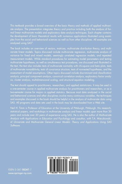 This book provides a broad overview of the basic theory and methods of applied multivariate analysis. The presentation integrates both theory and practice including both the analysis of formal linear multivariate models and exploratory data analysis techniques. Each chapter contains the development of basic theoretical results with numerous applications illustrated using examples from the social and behavioral sciences, and other disciplines. All examples are analyzed using SAS for Windows Version 8.0.