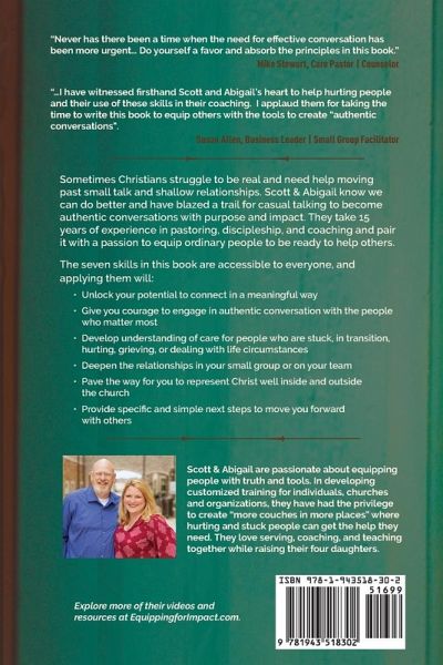 Sometimes Christians struggle to be real and need help moving past small talk and shallow relationships. Scott & Abigail know we can do better and have blazed a trail for casual talking to become authentic conversations with purpose and impact. They take 15 years of experience in pastoring, discipleship, and coaching and pair it with a passion to equip ordinary people to be ready to help others. The seven skills in this book are accessible to everyone, and applying them will: ¿ Unlock your potential to connect in a meaningful way ¿ Give you courage to engage in authentic conversation with the people who matter most ¿ Develop understanding of care for people who are stuck, in transition, hurting, grieving, or dealing with life circumstances ¿ Deepen the relationships in your small group or on your team ¿ Pave the way for you to represent Christ well inside and outside the church ¿ Provide specific and simple next steps to move you forward with others