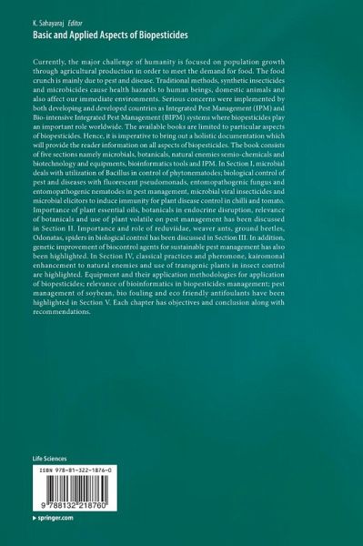Currently, the major challenge of humanity is focused on population growth through agricultural production in order to meet the demand for food. The food crunch is mainly due to pest and disease. Traditional methods, synthetic insecticides and microbicides cause health hazards to human beings, domestic animals and also affect our immediate environments. Serious concerns were implemented by both developing and developed countries as Integrated Pest Management (IPM) and Bio-intensive Integrated Pest Management (BIPM) systems where biopesticides play an important role worldwide. The available books are limited to particular aspects of biopesticides. Hence, it is imperative to bring out a holistic documentation which will provide the reader information on all aspects of biopesticides. The book consists of five sections namely microbials, botanicals, natural enemies semio- chemicals and biotechnology and equipments, bioinformatics tools and IPM. In Section I, microbial deals with utilization of Bacillus in control of phytonematodes; biological control of pest and diseases with fluorescent pseudomonads, entomopathogenic fungus and entomopathogenic nematodes in pest management, microbial viral insecticides and microbial elicitors to induce immunity for plant disease control in chilli and tomato. Importance of plant essential oils, botanicals in endocrine disruption, relevance of botanicals and use of plant volatile on pest management has been discussed in Section II. Importance and role of reduviidae, weaver ants, ground beetles, Odonatas, spiders in biological control has been discussed in Section III. In addition, genetic improvement of biocontrol agents for sustainable pest management has also been highlighted. In Section IV, classical practices and pheromone, kairomonal enhancement to natural enemies and use of transgenic plants in insect control are highlighted. Equipment and their application methodologies for application of biopesticides; relevance ofbioinformatics in biopesticides management; pest management of soybean, bio fouling and eco friendly antifoulants have been highlighted in Section V. Each chapter has objectives and conclusion along with recommendations.