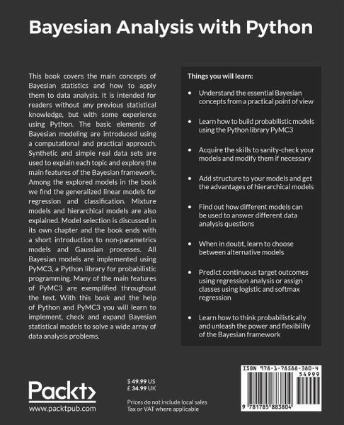 Unleash the power and flexibility of the Bayesian framework Key Features:Simplify the Bayes process for solving complex statistical problems using Python; Tutorial guide that will take the you through the journey of Bayesian analysis with the help of sample problems and practice exercises; Learn how and when to use Bayesian analysis in your applications with this guide. Book Description: The purpose of this book is to teach the main concepts of Bayesian data analysis. We will learn how to effectively use PyMC3, a Python library for probabilistic programming, to perform Bayesian parameter estimation, to check models and validate them. This book begins presenting the key concepts of the Bayesian framework and the main advantages of this approach from a practical point of view. Moving on, we will explore the power and flexibility of generalized linear models and how to adapt them to a wide array of problems, including regression and classification. We will also look into mixture models and clustering data, and we will finish with advanced topics like non-parametrics models and Gaussian processes. With the help of Python and PyMC3 you will learn to implement, check and expand Bayesian models to solve data analysis problems. What You Will Learn:Understand the essentials Bayesian concepts from a practical point of view Learn how to build probabilistic models using the Python library PyMC3 Acquire the skills to sanity-check your models and modify them if necessary Add structure to your models and get the advantages of hierarchical models Find out how different models can be used to answer different data analysis questions When in doubt, learn to choose between alternative models. Predict continuous target outcomes using regression analysis or assign classes using logistic and softmax regression. Learn how to think probabilistically and unleash the power and flexibility of the Bayesian framework Who this book is for: Students, researchers and data scientists who wish to learn Bayesian data analysis with Python and implement probabilistic models in their day to day projects. Programming experience with Python is essential. No previous statistical knowledge is assumed.
