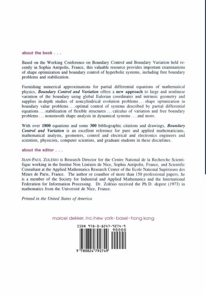 Based on the Working Conference on Boundary Control and Boundary Variation held in Sophia-Antipolis, France, this work provides important examinations of shape optimization and boundary control of hyperbolic systems, including free boundary problems and stabilization. It offers a new approach to large and nonlinear variation of the boundary using global Eulerian co-ordinates and intrinsic geometry.