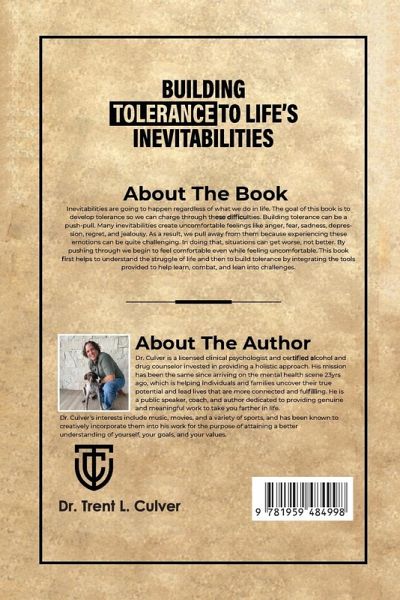 Inevitabilities are going to happen regardless of what we do in life. The goal of this book is to develop tolerance so we can charge through these difficulties. Building tolerance can be a push-pull. Many inevitabilities create uncomfortable feelings like anger, fear, sadness, depression, regret, and jealousy. As a result, we pull away from them because experiencing these emotions can be quite challenging. In doing that, situations can get worse, not better. By pushing through we begin to feel comfortable even while feeling uncomfortable. This book first helps to understand the struggle of life and then to build tolerance by integrating the tools provided to help learn, combat, and lean into challenges