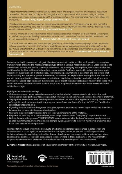 Featuring in-depth coverage of categorical and nonparametric statistics, this book provides a conceptual framework for choosing the most appropriate type of test in various research scenarios. Class tested at the University of Nevada, the book's clear explanations of the underlying assumptions, computer simulations, and Exploring the Concept boxes help reduce reader anxiety. Problems inspired by actual studies provide meaningful illustrations of the techniques. The underlying assumptions of each test and the factors that impact validity and statistical power are reviewed so readers can explain their assumptions and how tests work in future publications. Numerous examples from psychology, education, and other social sciences demonstrate varied applications of the material. Basic statistics and probability are reviewed for those who need a refresher. Mathematical derivations are placed in optional appendices for those interested in this detailed coverage. Highlights include the following: Unique coverage of categorical and nonparametric statistics better prepares readers to select the best technique for their particular research project; however, some chapters can be omitted entirely if preferred. Step-by-step examples of each test help readers see how the material is applied in a variety of disciplines. Although the book can be used with any program, examples of how to use the tests in SPSS and Excel foster conceptual understanding. Exploring the Concept boxes integrated throughout prompt students to review key material and draw links between the concepts to deepen understanding. Problems in each chapter help readers test their understanding of the material. Emphasis on selecting tests that maximize power helps readers avoid "marginally" significant results. Website (www.routledge.com/9781138787827) features datasets for the book's examples and problems, and for the instructor, PowerPoint slides, sample syllabi, answers to the even-numbered problems, and Excel data sets for lecture purposes. Intended for individual or combined graduate or advanced undergraduate courses in categorical and nonparametric data analysis, cross-classified data analysis, advanced statistics and/or quantitative techniques taught in psychology, education, human development, sociology, political science, and other social and life sciences, the book also appeals to researchers in these disciplines. The nonparametric chapters can be deleted if preferred. Prerequisites include knowledge of t tests and ANOVA.