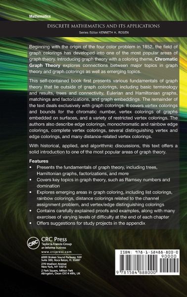 Beginning with the origin of the four color problem in 1852, the field of graph colorings has developed into one of the most popular areas of graph theory. Introducing graph theory with a coloring theme, Chromatic Graph Theory explores connections between major topics in graph theory and graph colorings as well as emerging topics. This self-contained book first presents various fundamentals of graph theory that lie outside of graph colorings, including basic terminology and results, trees and connectivity, Eulerian and Hamiltonian graphs, matchings and factorizations, and graph embeddings. The remainder of the text deals exclusively with graph colorings. It covers vertex colorings and bounds for the chromatic number, vertex colorings of graphs embedded on surfaces, and a variety of restricted vertex colorings. The authors also describe edge colorings, monochromatic and rainbow edge colorings, complete vertex colorings, several distinguishing vertex and edge colorings, and many distance-related vertex colorings. With historical, applied, and algorithmic discussions, this text offers a solid introduction to one of the most popular areas of graph theory.