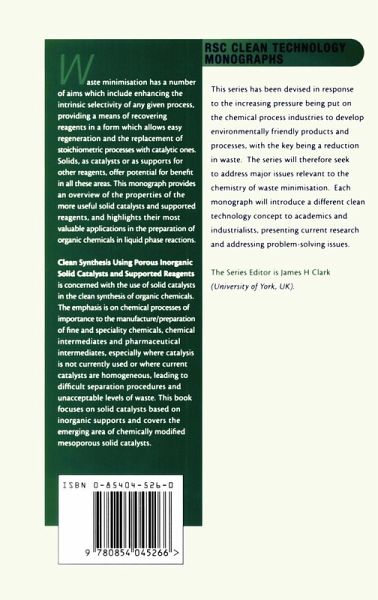 Waste minimisation has a number of aims which include enhancing the intrinsic selectivity of any given process, providing a means of recovering reagents in a form which allows easy regeneration and the replacement of stoichiometric processes with catalytic ones. Solids, as catalysts or as supports for other reagents, offer potential for benefit in all these areas. This monograph provides an overview of the properties of the more useful solid catalysts and supported reagents, and highlights their most valuable applications in the preparation of organic chemicals in liquid phase reactions. Clean Synthesis Using Porous Inorganic Solid Catalysts and Supported Reagents is concerned with the use of solid catalysts in the clean synthesis of organic chemicals. The emphasis is on chemical processes of importance to the manufacture/preparation of fine and speciality chemicals, chemical intermediates and pharmaceutical intermediates, especially where catalysis is not currently used or where current catalysts are homogeneous, leading to difficult separation procedures and unacceptable levels of waste. This book focuses on solid catalysts based on inorganic supports and covers the emerging area of chemically modified mesoporous solid catalysts.