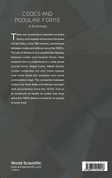 There are connections between invariant theory and modular forms since the times of Felix Klein, in the 19th century, connections between codes and lattices since the 1960's. The aim of the book is to explore the interplay between codes and modular forms. Here modular form is understood in a wide sense (Jacobi forms, Siegel forms, Hilbert forms). Codes comprises not only linear spaces over finite fields but modules over some commutative rings. The connection between codes over finite fields and lattices has been well documented since the 1970s. Due to an avalanche of results on codes over ring...