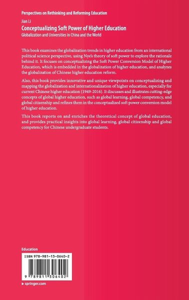 Also, this book provides innovative and unique viewpoints on conceptualizing and mapping the globalization and internationalization of higher education, especially for current Chinese higher education (1949-2016). It discusses and illustrates cutting-edge concepts of global higher education, such as global learning, global competency, and global citizenship and refines them in the conceptualized soft power conversion model of higher education.