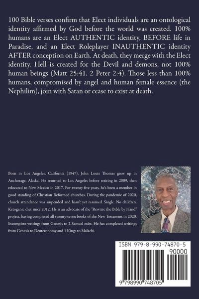 100 Bible verses confirm that Elect individuals are an ontological identity affirmed by God before the world was created. 100% humans are an Elect AUTHENTIC identity, BEFORE life in Paradise, and an Elect Roleplayer INAUTHENTIC identity AFTER conception on Earth. At death, they merge with the Elect identity. Hell is created for the Devil and demons, not 100% human beings (Matt 25:41, 2 Peter 2:4). Those less than 100% humans, compromised by angel and human female essence (the Nephilim), join with Satan or cease to exist at death.