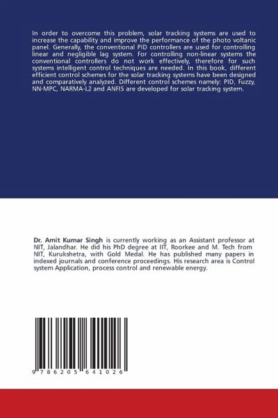In order to overcome this problem, solar tracking systems are used to increase the capability and improve the performance of the photo voltanic panel. Generally, the conventional PID controllers are used for controlling linear and negligible lag system. For controlling non-linear systems the conventional controllers do not work effectively, therefore for such systems intelligent control techniques are needed. In this book, different efficient control schemes for the solar tracking systems have been designed and comparatively analyzed. Different control schemes namely: PID, Fuzzy, NN-MPC, NARMA...