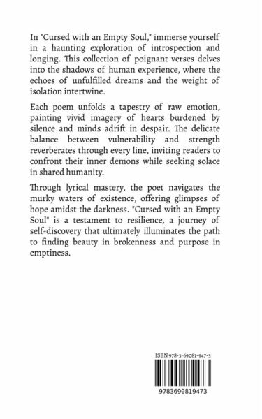 In "Cursed with an Empty Soul," immerse yourself in a haunting exploration of introspection and longing. This collection of poignant verses delves into the shadows of human experience, where the echoes of unfulfilled dreams and the weight of isolation intertwine. Each poem unfolds a tapestry of raw emotion, painting vivid imagery of hearts burdened by silence and minds adrift in despair. The delicate balance between vulnerability and strength reverberates through every line, inviting readers to confront their inner demons while seeking solace in shared humanity. Through lyrical mastery, the poet navigates the murky waters of existence, offering glimpses of hope amidst the darkness. "Cursed with an Empty Soul" is a testament to resilience, a journey of self-discovery that ultimately illuminates the path to finding beauty in brokenness and purpose in emptiness.