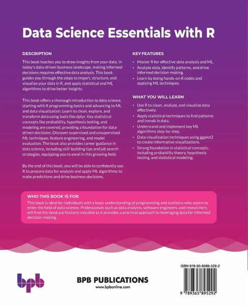 DESCRIPTION This book teaches you to draw insights from your data. In today's data-driven business landscape, making informed decisions requires effective data analysis. This book guides you through the steps to import, structure, and visualize your data in R, and apply statistical and ML algorithms to drive better insights. This book offers a thorough introduction to data science, starting with R programming basics and advancing to ML and data visualization. Learn to clean, explore, and transform data using tools like dplyr. Key statistical concepts like probability, hypothesis testing, and m...