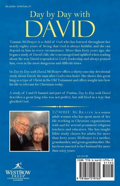 Tommie McBrayer is a child of God who has learned throughout her nearly eighty years of living that God is always faithful, and she can depend on him in every circumstance. More than forty years ago, she began a study of David's life; she's encouraged and uplifted when reading about the way David responded to God's leadership and always praised him, even in the most dangerous and difficult times. In Day by Day with David, McBrayer offers a thirty-one-day devotional study about David, the man after God's own heart. She shows this great king as a type of Christ in the Old Testament and offers insight into how his life is relevant for Christians today. A study of I and II Samuel and part of Psalms, Day by Day with David describes a great king who was not perfect, but still lived in a way that glorified God.
