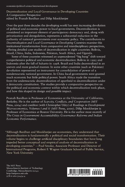 Over the past three decades the developing world has seen increasing devolution of political and economic power to local governments. Decentralization is considered an important element of participatory democracy and, along with privatization and deregulation, represents a substantial reduction in the authority of national governments over economic policy. The contributors to Decentralization and Local Governance in Developing Countries examine this institutional transformation from comparative and interdisciplinary perspectives, offering detailed case studies of decentralization in eight countries: Bolivia, Brazil, China, India, Indonesia, Pakistan, South Africa, and Uganda. Some of these countries witnessed an unprecedented "big bang" shift toward comprehensive political and economic decentralization: Bolivia in 1995 and Indonesia after the fall of Suharto in 1998. Brazil and India decentralized in an uneven and more gradual manner. In some other countries (such as Pakistan), devolution represented an instrument for consolidation of power of a nondemocratic national government. In China, local governments were granted much economic but little political power. South Africa made the transition from the undemocratic decentralization of apartheid to decentralization under a democratic constitution. The studies provide a comparative perspective on the political and economic context within which decentralization took place, and how this shaped its design and possible impact. Contributors Omar Azfar, Gianpaolo Baiocchi, Pranab Bardhan, Shubham Chaudhuri, Ali Cheema, Jean-Paul Faguet, Bert Hofman, Kai Kaiser, Philip E. Keefer, Asim Ijaz Khwaja, Justin Yifu Lin, Mingxing Liu, Jeffrey Livingston, Patrick Meagher, Dilip Mookherjee, Ambar Narayan, Adnan Qadir, Ran Tao, Tara Vishwanath, Martin Wittenberg