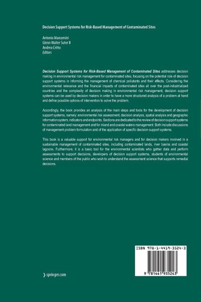 Accordingly, the book provides an analysis of the main steps and tools for the development of decision support systems, namely: environmental risk assessment, decision analysis, spatial analysis and geographic information system, indicators and endpoints. Sections are dedicated to the review of decision support systems for contaminated land management and for inland and coastal waters management. Both include discussions of management problem formulation and of the application of specific decision support systems.