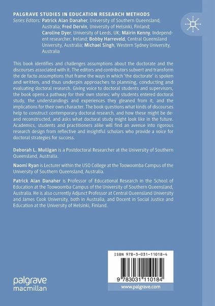 This book identifies and challenges assumptions about the doctorate and the discourses associated with it. The editors and contributors subvert and transform the de facto assumptions that frame the ways in which 'the doctorate' is spoken and written, and thus underpin approaches to planning, conducting and evaluating doctoral research. Giving voice to doctoral students and supervisors, the book opens a pathway for their own stories: why students entered doctoral study, the understandings and experiences they gleaned from it, and the implications for their own character. The book questions what kinds of discourses help to construct contemporary doctoral research, and how these might be de- and reconstructed, and asks what doctoral study might look like in the future. Academics, students and practitioners alike will find an avenue into rigorous research design from reflective and insightful scholars who provide a voice for doctoral strategies for success.