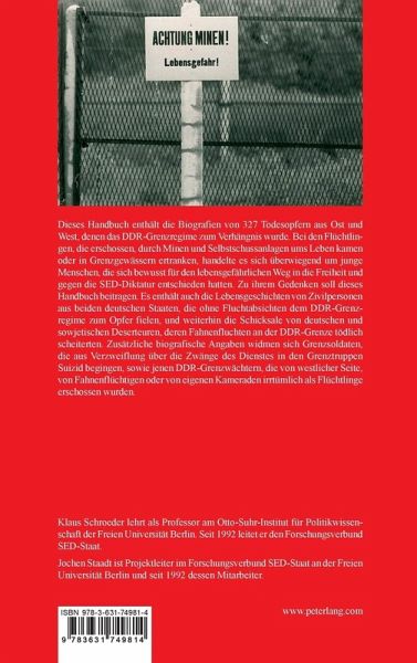 Dieses Handbuch enthält die Biografien von 327 Todesopfern aus Ost und West, denen das DDR-Grenzregime zum Verhängnis wurde. Bei den Flüchtlingen, die erschossen, durch Minen und Selbstschussanlagen ums Leben kamen oder in Grenzgewässern ertranken, handelte es sich überwiegend um junge Menschen, die sich bewusst für den lebensgefährlichen Weg in die Freiheit und gegen die SED-Diktatur entschieden hatten. Zu ihrem Gedenken soll dieses Handbuch beitragen. Es enthält auch die Lebensgeschichten von Zivilpersonen aus beiden deutschen Staaten, die ohne Fluchtabsichten dem DDR-Grenzregime zum Opfer fielen, und weiterhin die Schicksale von deutschen und sowjetischen Deserteuren, deren Fahnenfluchten an der DDR-Grenze tödlich scheiterten. Zusätzliche biografische Angaben widmen sich Grenzsoldaten, die aus Verzweiflung über die Zwänge des Dienstes in den Grenztruppen Suizid begingen, sowie jenen DDR-Grenzwächtern, die von westlicher Seite, von Fahnenflüchtigen oder von eigenen Kameraden, irrtümlich als Flüchtlinge erschossen wurden.