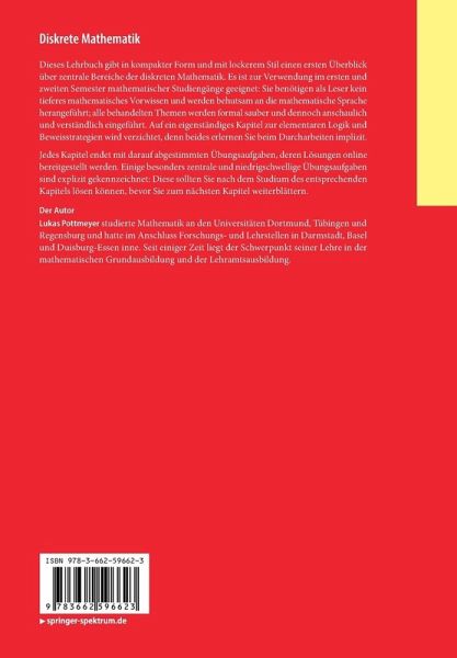 Dieses Lehrbuch gibt in kompakter Form und mit lockerem Stil einen ersten Überblick über zentrale Bereiche der diskreten Mathematik. Es ist zur Verwendung im ersten und zweiten Semester mathematischer Studiengänge geeignet: Sie benötigen als Leser kein tieferes mathematisches Vorwissen und werden behutsam an die mathematische Sprache herangeführt; alle behandelten Themen werden formal sauber und dennoch anschaulich und verständlich eingeführt. Auf ein eigenständiges Kapitel zur elementaren Logik und Beweisstrategien wird verzichtet, denn beides erlernen Sie beim Durcharbeiten implizit.