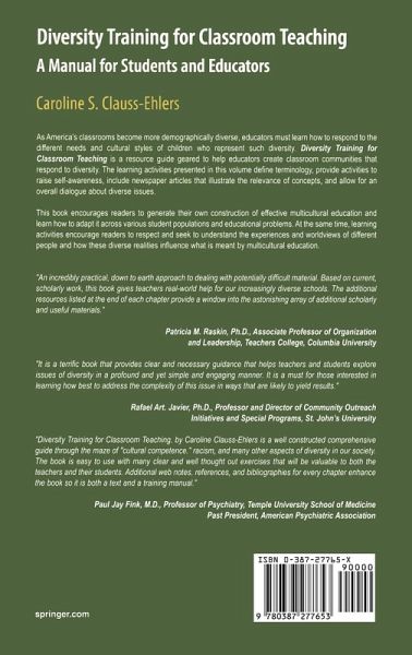 Acknowledgements Section 1. Foundations 3 Chapter 1. Introduction: How to Use this Manual.. ................... Chapter 2. How Do We Understand Difference?. ...................... 17 Section 2. Dimensions of Difference: Culture, Socioeconomic Status, Race, Ethnicity, Language, and Parental Partnership 29 Chapter 3. Cultural Values and Worldview.. ............................ Chapter 4. Socioeconomic Status.. ....................................... 4 1 ............................................ 5 1 Chapter 5. Race and Ethnicity.. Chapter 6. Language in the Classroom.. .................................. 67 Chapter 7. Working with Diverse Families: Parental Partnership in Education.. ........................................ 8 1 viii Table of Contents Section 3 . Dimensions of Difference: Gender Chapter 8 . Gender ............................................................ Chapter 9 . Sexual Orientation and Youth ................................. Section 4 . Other Challenges to Diversity Chapter 10 . Bullying in Schools ............................................. Chapter 1 1 . Creating Community through Classroom Management .. Chapter 12 . Child Abuse and Resilience .................................. Section 5 . Understanding Exceptional Microcultures Chapter 13 . Exceptional Microcultures: Dealing with Trauma ...... Chapter 14 . Exceptional Microcultures: Youth with Emotional Disturbance- Childhood Depression. Eating Disorders .................. Chapter 15 . Exceptional Microcultures: How to Make a Referral .. Section 6 . Conclusion Chapter 16 . Conclusion: The Multicultural Educator .................. Selected Bibliography ...................................................... Glossary of Terms ........................................................... Appendix A .Sample Course Syllabus .................................... Appendix B . Educational Intervention Proposal Paper ................. Index ............................................................................ Diversity Training for Classroom Teaching: A Manual for Students and Educators is an excellent guide for preparing responsive teachers, capable of exploring the roots of a wide variety of types of diversity and acting with knowledge and sensitivity to improve student learning and self-efficacy.