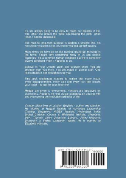 It's not always going to be easy to reach our dreams in life. The loftier the dream the more challenging the path. Often times it seems impossible. The road to long-term success is seldom a straight line. It's not where you start in life, it's where you end up that counts. Many times we have all felt like quitting, giving up, throwing in the towel. Failure isn't something many of us can handle gracefully. It's a common human condition but we're somehow always surprised when it happens to us. Believe In Your Dream! Don't sell yourself short. You are stronger than you think. You are made of sterner stuff. One little setback is not enough to stop you. This book challenges readers to realise that every insult, every disappointment, every pain and every hurt that breaks your heart - is fuel for your inner fire! Medals are given to overcomers. Honours are bestowed on champions. Readers will find crucial strategies on dealing with and overcoming the inevitable setbacks of life!