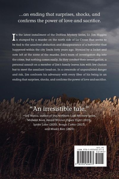 In the latest installment of the Driftless Mystery Series Lt. Jim Higgins is stumped by a murder on the north side of La Crosse that seems to be tied to the unsolved abduction and disappearance of a babysitter that happened within the city limits forty years ago. Stymied by a locket and note left at the scene of the murder Jim's team of investigators dig into the crime but nothing comes easily. As they conduct their investigation a personal assault on a member of Jim's family leaves him with few choices but to meet the assailant head-on. In a crescendo of unparalleled danger and risk Jim confr...