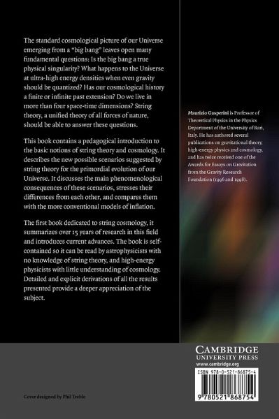 The standard cosmological picture of our Universe emerging from a 'big bang' leaves open many fundamental questions which string theory, a unified theory of all forces of nature, should be able to answer. The first book dedicated to string cosmology, it contains a pedagogical introduction to the basic notions of the subject. It describes the new possible scenarios suggested by string theory for the primordial evolution of our Universe. It discusses the main phenomenological consequences of these scenarios, stresses their differences from each other, and compares them to the more conventional models of inflation. The book summarizes over 15 years of research in this field and introduces current advances. It is self-contained, so it can be read by astrophysicists with no knowledge of string theory, and high-energy physicists with little understanding of cosmology. Detailed and explicit derivations of all the results presented provide a deeper appreciation of the subject.