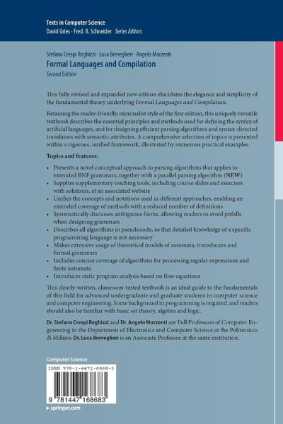 This revised and expanded new edition elucidates the elegance and simplicity of the fundamental theory underlying formal languages and compilation. Retaining the reader-friendly style of the 1st edition, this versatile textbook describes the essential principles and methods used for defining the syntax of artificial languages, and for designing efficient parsing algorithms and syntax-directed translators with semantic attributes. Features: presents a novel conceptual approach to parsing algorithms that applies to extended BNF grammars, together with a parallel parsing algorithm (NEW); supplies supplementary teaching tools at an associated website; systematically discusses ambiguous forms, allowing readers to avoid pitfalls; describes all algorithms in pseudocode; makes extensive usage of theoretical models of automata, transducers and formal grammars; includes concise coverage of algorithms for processing regular expressions and finite automata; introduces static program analysisbased on flow equations.