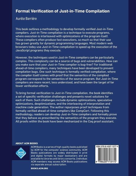 This book outlines a methodology to develop formally verified Just-in-Time compilers. Just-in-Time compilation is a technique to execute programs, where execution is interleaved with optimizations of the program itself. These compilers often produce fast executions, so much so that their use has grown greatly for dynamic programming languages. Most modern web browsers today use Just-in-Time compilation to speed up the execution of the JavaScript programs they execute. However, the techniques used in Just-in-Time compilers can be particularly complex. This complexity can be a source of bugs and vulnerabilities. How can you make sure that your Just-in-Time compiler is bug-free? For traditional ahead-of-time compilers, many techniques have been developed to prevent compilation bugs. One such technique is formally verified compilation, where the compiler itself comes with proof that the semantics of the compiled program correspond to the semantics of the source program. But Just-in-Time compilers are more recent, less understood, and have been the target of far fewer verification efforts. To bring formal verification to Just-in-Time compilation, the book identifies a set of specific verification challenges and presents novel solutions for each of them. Such challenges include dynamic optimizations, speculative optimizations, deoptimizations, and the interleaving of interpretation and machine code generation. The author repurposes proof techniques from formally verified ahead-of-time compilers like CompCert. Following this methodology, readers can develop Just-in-Time compilers and formally prove that they behave as prescribed by the semantics of the program they execute. All proofs within the book have been mechanized in the Coq proof assistant.