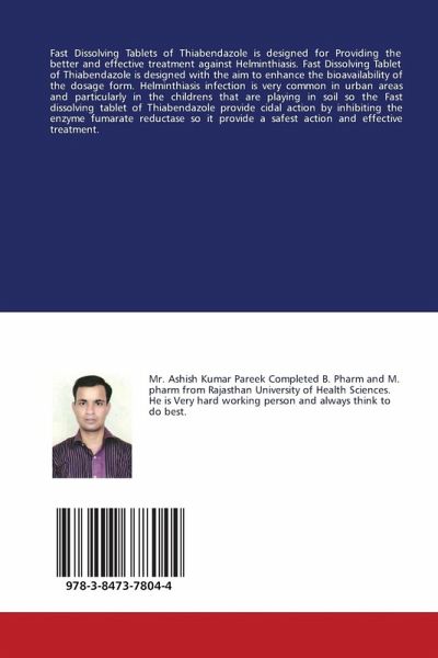 Fast Dissolving Tablets of Thiabendazole is designed for Providing the better and effective treatment against Helminthiasis. Fast Dissolving Tablet of Thiabendazole is designed with the aim to enhance the bioavailability of the dosage form. Helminthiasis infection is very common in urban areas and particularly in the childrens that are playing in soil so the Fast dissolving tablet of Thiabendazole provide cidal action by inhibiting the enzyme fumarate reductase so it provide a safest action and effective treatment.