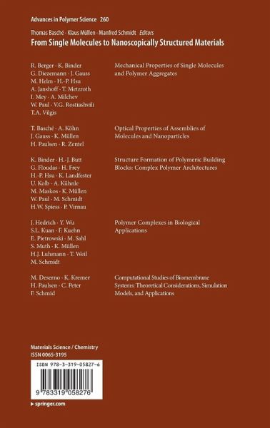Mechanical Properties of Single Molecules and Polymer Aggregates Rüdiger Berger, Kurt Binder, Gregor Diezemann, Jürgen Gauß, Mark Helm, Katharina Landfester, Wolfgang Paul (Halle), Peter Virnau. Optical Properties of Individual Molecular Aggregates and Nano Particles Thomas Basché, Hans-Jürgen Butt, Gregor Diezemann, Jürgen Gauß, Klaus Müllen, Harald Paulsen, Carsten Sönnichsen, Rudolf Zentel. Structure Formation of Polymeric Building Blocks I: Self-assembly of Copolymers Kurt Binder, Holger Frey, Andreas Kilbinger (Univ. Fribourg), Ute Kolb, Michael Maskos (IMM Mainz), Wolfgang Paul (Univ. Halle), Hans Wolfgang Spiess. Structure Formation of Polymeric Building Blocks II: Complex Polymer Architectures Kurt Binder, Hans Jürgen Butt, Angelika Kühnle, Klaus Müllen, Wolfgang Paul (Univ. Halle), Erwin Schmidt, Manfred Schmidt, Hans Wolfgang Spiess, Thomas Vilgis. Structure Formation of Polymeric Building Blocks III: Polymer Complexes in Biological Applications Kurt Kremer, Heiko Luhmann, Christine Peter, Friederike Schmid, Erwin Schmidt, Manfred Schmidt, Eva Sinner (Univ. of Natural Resources, Vienna), Tanja Weil (Univ. Ulm).