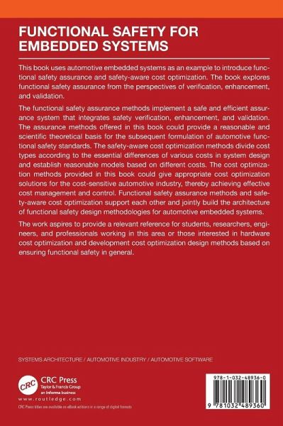 The functional safety assurance methods implement a safe and efficient assurance system that integrates safety verification, enhancement, and validation. The assurance methods offered in this book could provide a reasonable and scientific theoretical basis for the subsequent formulation of automotive functional safety standards. The safety-aware cost optimization methods divide cost types according to the essential differences of various costs in system design and establish reasonable models based on different costs. The cost optimization methods provided in this book could give appropriate cost optimization solutions for the cost-sensitive automotive industry, thereby achieving effective cost management and control. Functional safety assurance methods and safety-aware cost optimization support each other and jointly build the architecture of functional safety design methodologies for automotive embedded systems.