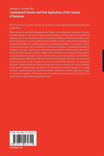 This textbook is intended for graduate and higher-level college and university students, introducing them to the basic concepts and calculation methods used in the calculus of variations. It covers the preliminaries, variational problems with fixed boundaries, sufficient conditions of extrema of functionals, problems with undetermined boundaries, variational problems of conditional extrema, variational problems in parametric forms, variational principles, direct methods for variational problems, variational principles in mechanics and their applications, and variational problems of functionals with vector, tensor and Hamiltonian operators. Many of the contributions are based on the authors' research, addressing topics such as the extension of the connotation of the Hilbert adjoint operator, definitions of the other three kinds of adjoint operators, the extremum function theorem of the complete functional, unified Euler equations in variational methods, variational theories of functionals with vectors, modulus of vectors, arbitrary order tensors, Hamiltonian operators and Hamiltonian operator strings, reconciling the Euler equations and the natural boundary conditions, and the application range of variational methods. The book is also a valuable reference resource for teachers as well as science and technology professionals.
