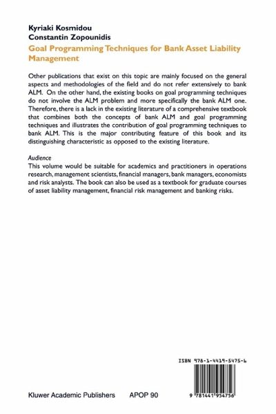Other publications that exist on this topic, are mainly focused on the general aspects and methodologies of the field and do not refer extensively to bank ALM. On the other hand the existing books on goal programming techniques do not involve the ALM problem and more specifically the bank ALM one. Therefore, there is a lack in the existing literature of a comprehensive text book that combines both the concepts of bank ALM and goal programming techniques and illustrates the contribution of goal programming techniques to bank ALM. This is the major contributing feature of this book and its distinguishing characteristic as opposed to the existing literature.