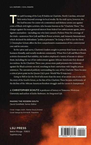 The 1968 burning of the Lazy B Stables in Charlotte, North Carolina, attracted little notice beyond coverage in local media. By the mid-1970s, however, the fire had become the center of a contentious and dubious arson case against a trio of Black civil rights activists, who became known as the "Charlotte Three." The charges against the men garnered interest from federal law enforcement agents, investigative journalists-- including one who later earned a Pulitzer Prize for coverage of the trials--numerous New Left and Black Power activists, and Amnesty International, which declared the defendants "political prisoners." In Going to Hell to Get the Devil, J. Christopher Schutz offers the first comprehensive examination of this controversial case and its outcome. In the 1960s and 1970s, Charlotte's leaders sought to portray their home as a placid, business-friendly, and racially moderate community. When New Left and Black Power activists threatened that stability, city leaders employed a variety of means to silence them, including the use of law enforcement against African Americans they deemed too zealous. In the Charlotte Three case, prosecutors paid prisoners for testimony against the Black activists on trial, resulting in their convictions with lengthy prison sentences. The unwanted publicity surrounding the case of the Charlotte Three became a critical pivot point in the Queen City's post-World War II trajectory. Going to Hell to Get the Devil tells more than the story of an arson case; it also tells the story of the South's future, as the fate of the Charlotte Three became emblematic of the decline of the African American freedom struggle and the causes it championed.