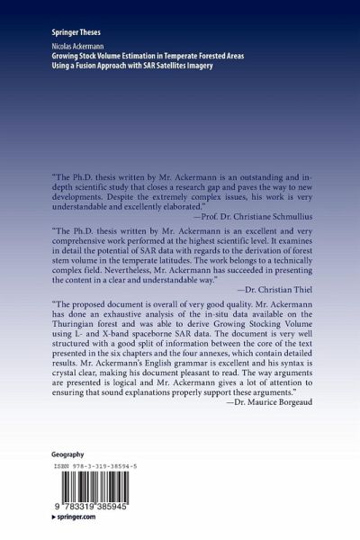 "The PhD thesis written by Mr. Ackermann is an outstanding and in-depth scientific study that closes a research gap and paves the way to new developments. Despite the extremely complex issues, his work is very understandable and excellently elaborated."Prof. Dr. Christiane Schmullius "The PhD thesis written by Mr. Ackermann is an excellent and very comprehensive work performed at the highest scientific level. It examines in detail the potential of SAR data with regards to the derivation of forest stem volume in the temperate latitudes. The work belongs to a technically complex field. Neverthel...
