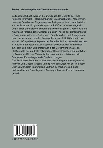 In diesem Lehrbuch werden die grundlegenden Begriffe der Theoretischen Informatik - Berechenbarkeit, Entscheidbarkeit, rekursive Funktionen, Regelsprachen, Turingmaschinen, Komplexität - auf der Basis der Programmiersprache PASCAL motiviert, abgeleitet und in einer einheitlichen Betrachtungsweise dargestellt. Ferner wird die Äquivalenz verschiedener Ansätze zu einer Theorie der Berechenbarkeit - Programme, rekursive Funktionen, Regelsprachen und Turingmaschinen - als weiteres zentrales Konzept herausgestellt. Während in den Kapiteln 1-7 qualitative Aspekte der Berechenbarkeit behandelt werden, ist Kapitel 8 den quantitativen Aspekten gewidmet. Die Komplexität, d.h. Zeit- bzw. Speicheraufwand für eine Berechnung, ist sowohl abhängig von dem zugrundeliegenden Berechnungsmodell als auch von dem zu lösenden Problem, da für ein bestimmtes Problem gewisse Schranken nicht unterschritten werden können. Bei einem so weitgespannten Gebiet wie der Theoretischen Informatik müssen zwangsläufig manche Einschränkungen bei der Stoffauswahl gemacht werden. So wird z.B. Semantik nur informell behandelt, Parallelität nur ansatzweise betrachtet oder Automatentheorie nur am Rand gestreift. Ziel der Stoffauswahl war es, ein möglichst umfassendes Bild der Theoretischen Informatik zu bieten und ein Fundament für weitergehende Studien zu legen. Das Buch setzt Grundkenntnisse aus den Anfängervorlesungen über Analysis und Lineare Algebra voraus. Um den Leser mit der Terminologie in diesem Buch vertraut zu machen, sind im Anhang diese mathematischen Grundlagen in knapper Form zusammengestellt.