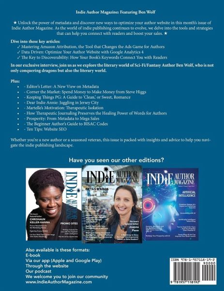 Unlock the power of metadata and discover new ways to optimize your author website in this month's issue of Indie Author Magazine. As the world of indie publishing continues to evolve, we delve into the tools and strategies that can help you connect with readers and boost your sales. Dive into these key articles: ¿ Mastering Amazon Attribution, the Tool that Changes the Ads Game for Authors ¿ Data Driven: Optimize Your Author Website with Google Analytics 4 ¿ The Key to Discoverability: How Your Book's Keywords Connect You with Readers In our exclusive interview, join us as we explore the literary world of Sci-Fi/Fantasy Author Ben Wolf, who is not only conquering dragons but also the literary world. Also in this issue: - Editor's Letter: A New View on Metadata - Corner the Market: Spend Money to Make Money from Steve Higgs - Keeping Things PG: A Guide to 'Clean,' or Sweet, Romance - Dear Indie Annie: Juggling in Jersey City - Martelle's Motivation: Therapeutic Isolation - How Therapeutic Journaling Preserves the Healing Power of Words for Authors - Prosperity: From Metadata to Mega Sales - The Beginner Author's Guide to BISAC Codes - Ten Tips: Website SEO Whether you're a new author or a seasoned veteran, this issue is packed with insights and advice to help you navigate the indie publishing landscape.